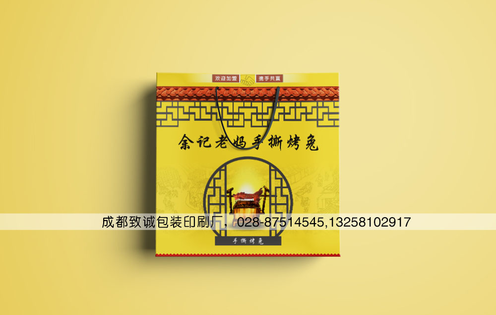 設計理念:整個老媽手撕兔手提袋設計采用復古的風格,復古的屋檐、復古的窗花、古代街景、人物作為底紋。體現出老媽手撕兔的傳統制作手藝歷史悠遠。手提袋用黃色為主體顏色,體現出產品的高貴品質。