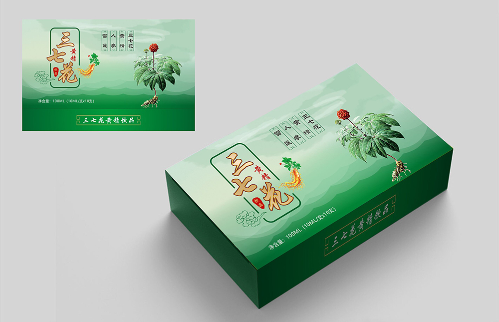 設計理念:本款包裝主要是打造一款“三七花黃精飲品”的保健產品品牌,包裝盒經過重新設計之后,無論是從版式結構上,還是色彩搭配上都融合了產品的品牌形象。整個包裝盒以綠色為主色調,正面以三七花、黃精、人參、雪蓮等原材料圖片作為宣傳實物圖,創意文字與圖片進行結合,最終進行規范和統一,這些內容信息都是以保健行業發展的角度進行考慮到的。